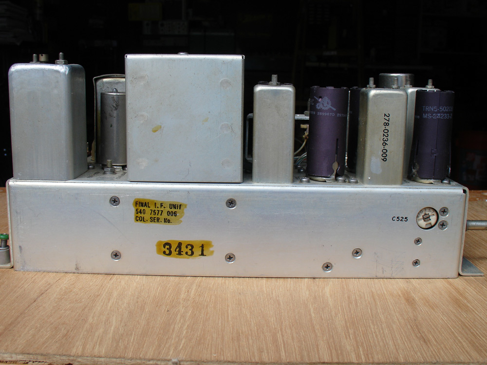 Collins IF Module: This photograph shows the side of the 455 kHz amplifier module from my latest R-390A. This module was actually manufactured by Collins. The lineage of the module is easily identified by the Collins stock number (540-7577-006) stenciled on the side just above the module’s serial number (3431). The large box just above the stock & serial number contains the Collins mechanical filters which give the R-390A its characteristically-superb selectivity. However, today many R-390A’s do not display the selectivity that was their hallmark for many years, as many of the mechanical filters have suffered from breakdown of the special foam that suspended the filter mechanism within the filter housing. This often causes the selectivity curve to skew to one side of the other, and in some cases may actually cause the filter to fail entirely.
