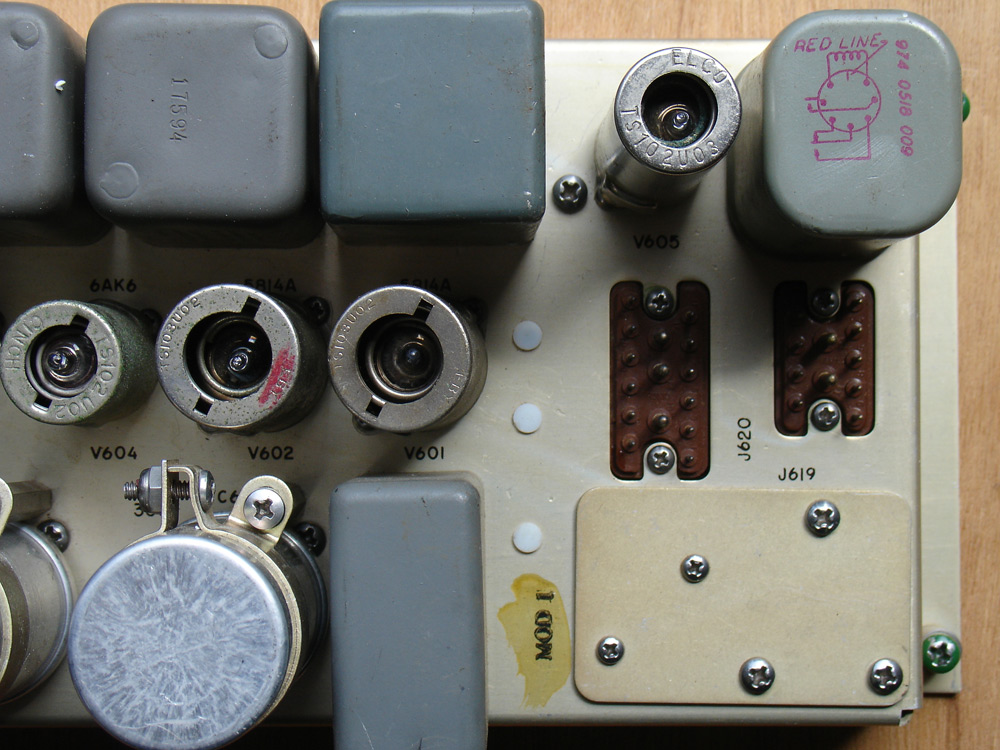 Audio Module: In this photo of the audio module we see one of the most outwardly-visible cost reduction changes made to the R-390A. The original R-390 receiver included a front panel squelch control, which allowed the operator to silence the background noise on the R-390’s tuned frequency when no transmissions were being received. While this seems like a worthwhile control, however, in reality it wasn’t all that effective because the impulsive noise typical of HF communications would frequently “open” the squelch, compromising its usefulness. Therefore, when it came to cost reduction, this circuit was one of the first to be considered for deletion. The metal plate on the right-hand side of the photograph covers a tube socket for a 6C4 squelch tube (the tube number is actually stenciled on the chassis beneath this plate). Thus, squelch can be added to the R-390A, although there is no control on the front panel for this function.