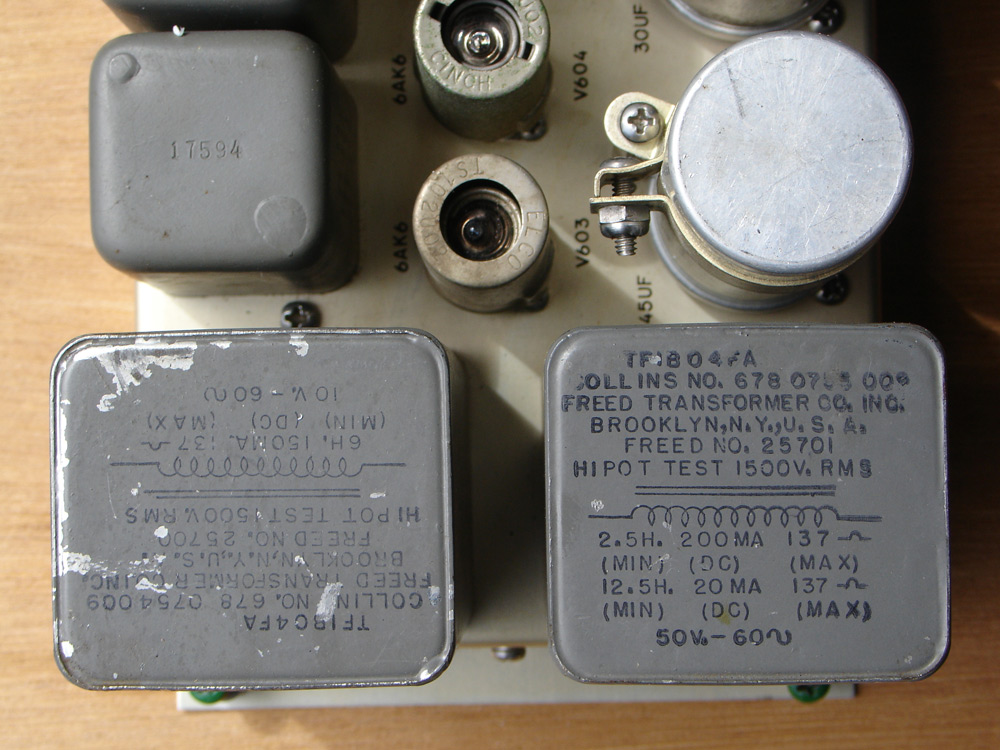 Audio Module, Another Perspective: This photograph shows only a portion of the R-390A audio module. Specifically, we see the two audio transformers which provide a local 600-ohm audio output as well as a 600-ohm line output. Although we can’t see the serial and stock number as in the IF module above, this module is also manufactured by Collins radio. Both audio output transformers in this photo are silk-screened “Freed Transformer Co, Inc.” a company which was a preferred transformer source for many Collins products. Just above the right-hand transformer is a cylindrical component with a hold-down strap. This is one of two electrolytic filter capacitors which are an integral part of the R-390A power supply. The R-390/R390A design is somewhat unique in that these capacitors plug into octal tube sockets, thus allowing a field technician to easily replace one of these multiple-section capacitors without any de-soldering. In fact, the entire design of the R-390 and the R-390A was based on a requirement to minimize the number of instances in which it would be necessary to heat up a soldering iron to make repairs. The modular design, along with an excellent understanding of which components were likely to fail under continuous use, greatly simplified the field maintenance of these fine receivers.