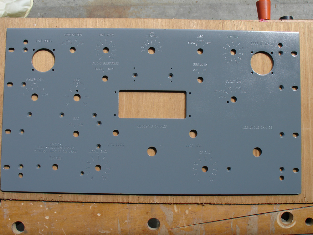 If you are fortunate enough to have an R-390 or R-390A with an engraved front panel, the panel can be sand blasted and repainted relatively easily. The photo above shows the front panel of my latest R-390A after sandblasting, priming with an aluminum primer, and a final coat of acrylic paint. All that’s remaining is to fill the engraving with water-based white paint. As you can see, this panel looks like new.