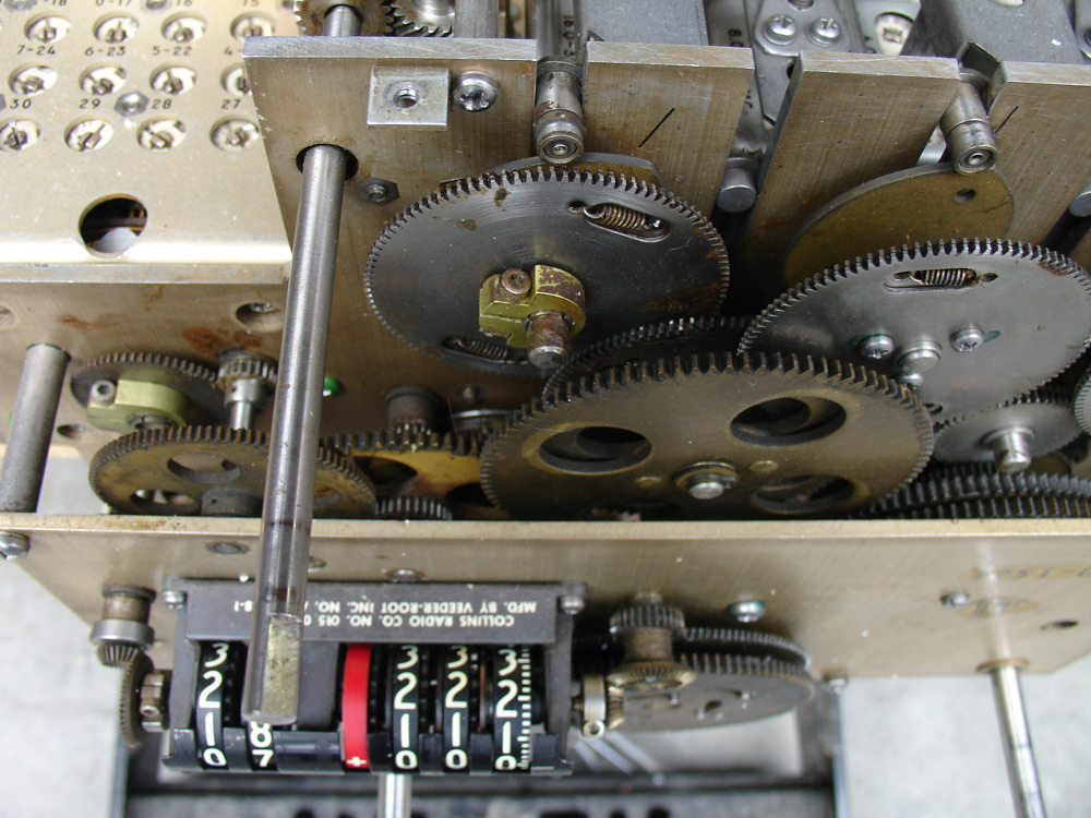 Digital Counter: When the R-390 was designed, the technology necessary to provide an electronic digital frequency display would have required additional hardware that would consume almost as much space and power as the R-390 itself. Instead of an electronic digital frequency counter, the Collins engineers took advantage of the R-390/R-390A’s excellent tuning linearity and used a mechanical digital frequency counter. While this counter, which was manufactured by the Veeder-Root Company, is intended to display the receiver’s operating frequency, it’s actually a mechanical readout of two key receiver aspects: (1) Which one of the receiver’s 32 bands is selected (displayed in the counter’s two most significant digits in MHz) and (2) the relative frequency (in kHz) of the receiver’s Permeability Tuned oscillator (PTO) in the display’s three least significant digits. On the far right you’ll notice small horizontal marks on the display. Each of these horizontal lines corresponds to a frequency change of 200 Hz. This level of tuning precision was unheard of in almost all receivers that preceded the R-390/ R-390A, and is impressive even by today’s standards when one considers the electromechanical design required. This level of precision was made possible through very exacting manufacturing tolerances in the design of the PTO and special linearizing cams, which allows the PTO to remain linear within less than 300 Hz across a 100 kHz tuning segment. The Collins PTO design is a classic example of excellence in engineering which I’ll touch upon when I have a chance to upload photos and text describing the PTO in more detail. In the meantime, you may want to read this excellent overview of the Collins PTO design as well as its internal construction.