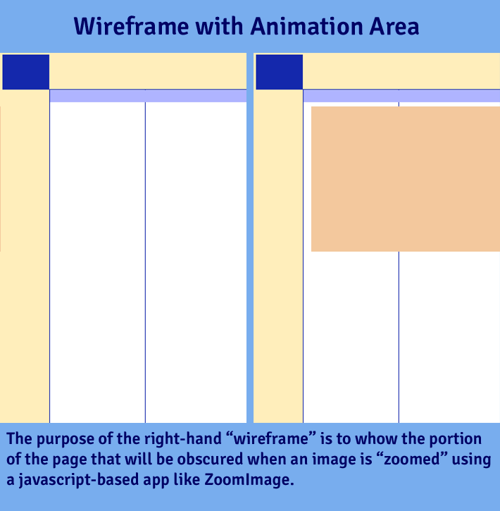 If you've never designed anything before, the usefulness of wireframes isn't obvious. But for Web designers they serve to help clarify which of many possible design approaches will be most effective. The wireframes depicted here show only the main content areas, and give an indication of where "zoomed" images will appear.